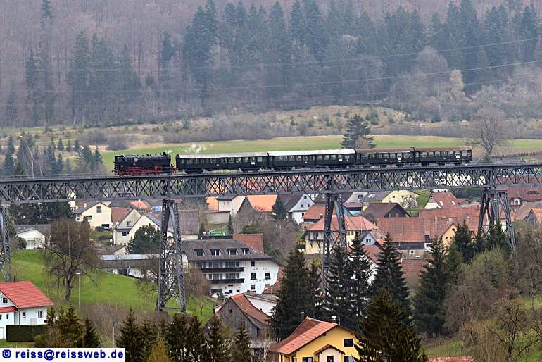 FK 262 der Bahnbetriebe Blumberg überquert das Epfenhofener Viadukt auf der Fahrt von Blumberg nach Weizen (09.04.2016).