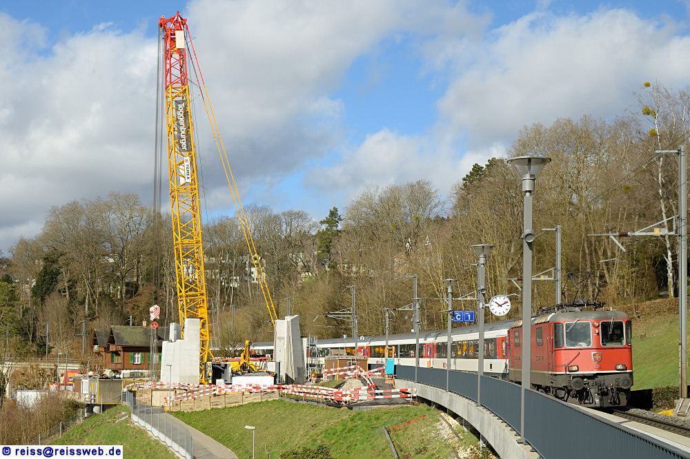 Der Terex-Raupenkran CC 3800 für den am Wochenende 12. - 14. März 2021 geplanten Brückenersatz am westlichen Ende des Haltepunktes Neuhausen-Rheinfall steht bereit. Bis 21:35 Uhr passieren die Züge die alte Brücke aus dem Jahr 1897 (Aufnahme vom 12.03.2021).