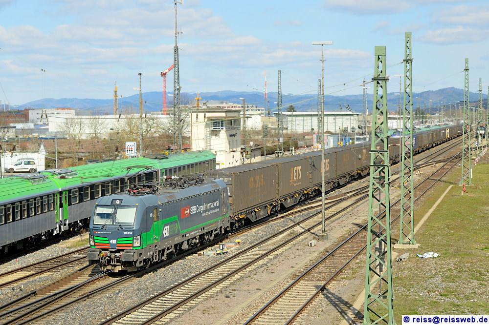 ELL 193 258 - vermietet an SBB Cargo - verlässt Freiburg Gbf in Richtung Basel. Im Hintergrund die Verladeanlage der "Rollenden Landstraße" (20.03.2021).