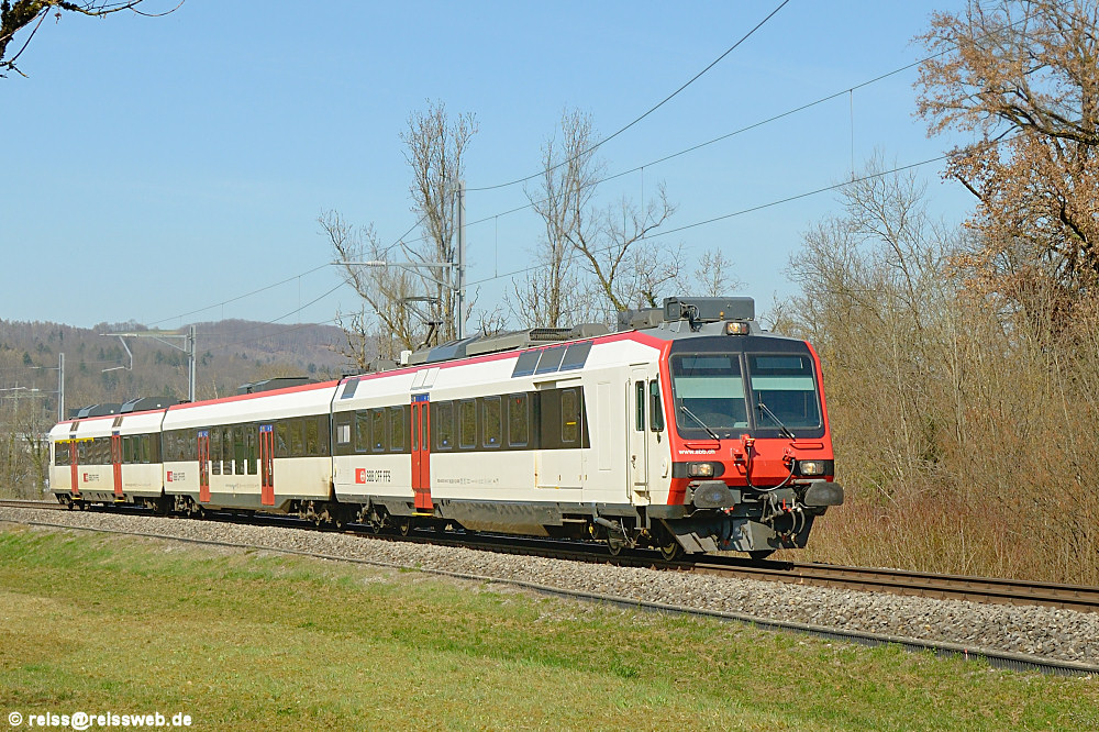 Zwischen Koblenz und Rietheim ist ein unerkannt gebliebener SBB-Domino (RBDe 560) als S27 8746 von Baden nach Zurzach unterwegs (Rietheim, 29.03.2021).