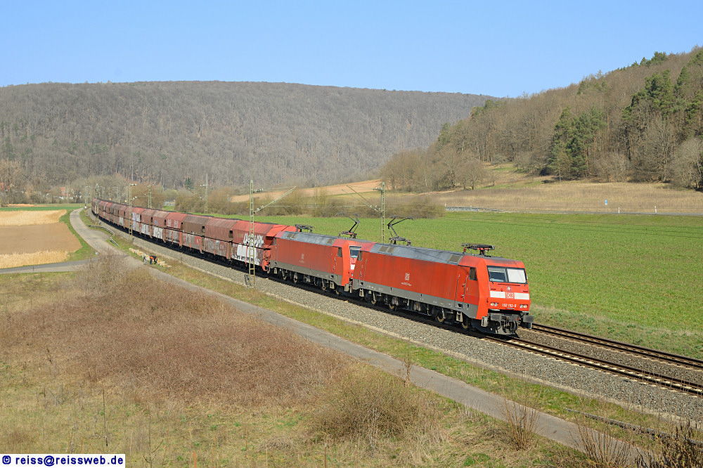DB Cargo 152 152 & 001 bringen eine Garnitur Falns-Wagen durch Wernfeld nach Süden (31.03.2021).