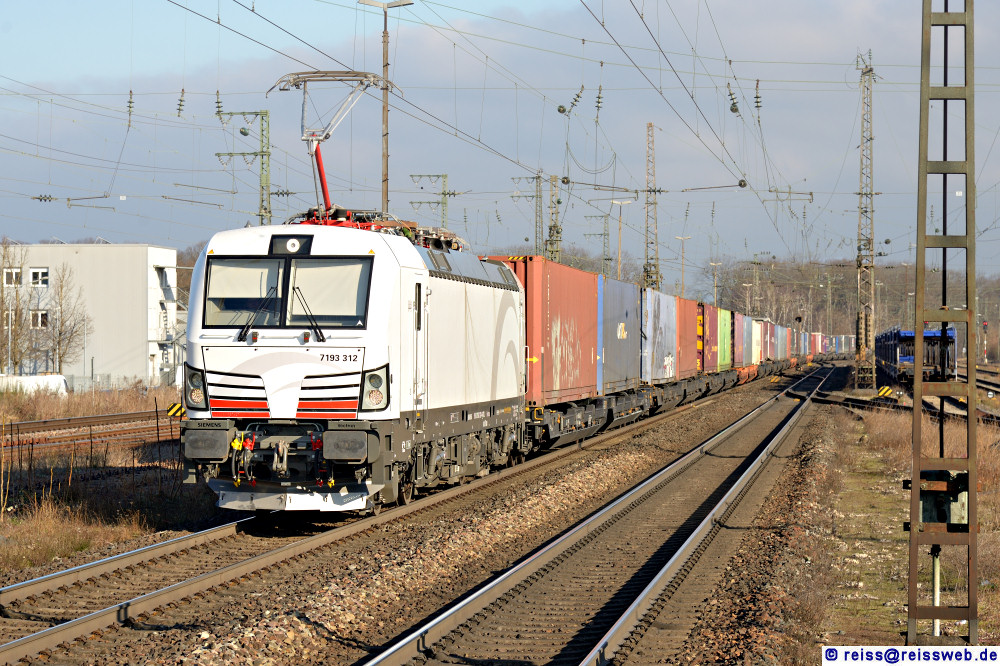 | TXL 7193 312 bringt einen KV-Zug durch Rastatt nach Süden. Warum ich "7193" schreibe, hat einen guten Grund: Bis Mitte 2024 hat "193" ausgereicht, weil standardmässig die "6" an der 5. Stelle der UIC-Nr. benutzt wurde; man hat sie i.d.R. nicht angeschrieben. Weil Siemens inzwischen mehr als 1500 Vectrons geliefert hat, sind die Nummern ausgegangen. Es gibt bereits eine "6193 312" von DB Cargo, deshalb ist man auf die "7" ausgewichen (16.01.2025). |