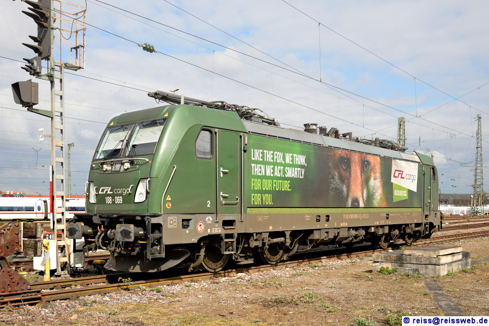 CFL 188 069 "Fuchs"ist eine von zehn Bombardier Traxx-Lokomotiven (060 - 069), die seit 2023 im Einsatz im Einsatz sind. Am 17.03.2025 wartet sie auf einem der nördlichen Abstellgleise im Karlsruher Hbf auf ihren nächsten Dienst.