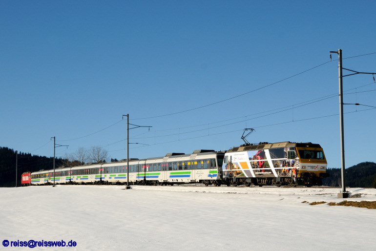 Auch die lokbespannten Kompositionen wurden bereits vor dem Fahrplanwechsel umgestellt, in der Übergangsphase fehlten noch zwei Wagen. Re 456 093 "Rhomberg Sersa Group" und 094 "Vögele Shoes" sind am 12.12.2013 bei Altmatt unterwegs