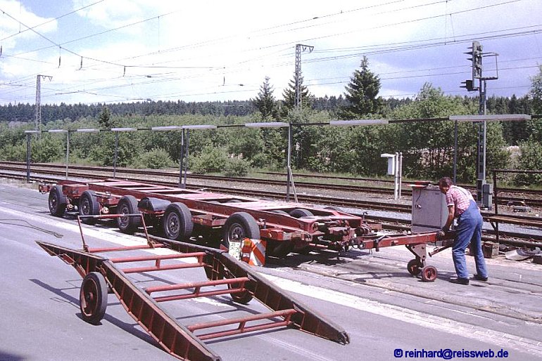Der Strassenroller Bauart Culemeyer mit dem notwendigen Zubehör (Auffahrrampe). Die Deichsel konnte an beiden Seiten angeschlossen werden, umständliches Rangieren zum Richtungswechsel war daher nicht notwendig.