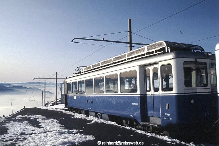 | Mangels "weisser Weihnacht" im Jahre 2002 (zumindest im Südwesten) ein Winterbild aus dem Jahre 1981: Triebwagen der Art-Rigi-Bahn (ARB) in der Station Rigi-Kulm. Damals noch eigenständig, wurde 1992 mit der VRB (Vitznau-Rigi-Bahn) zu den "Rigi-Bahnen" fusioniert. |