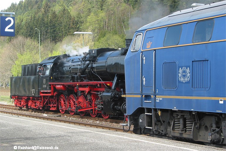 Begegnung in Immendingen zwischen 50 2988 der WTB und 218 473 mit Werbung für das König-Ludwig-II-Musical. 218 473 führt am 01. Mai 2003 den Kleber-Express Freiburg - München.
