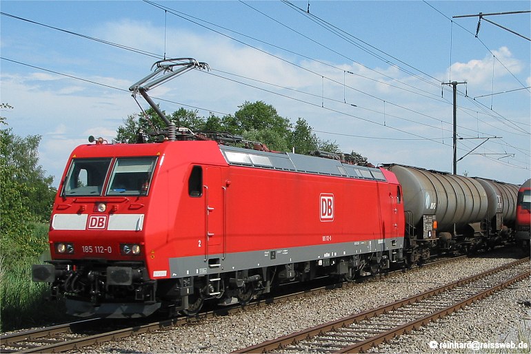 185 112 führt den Leerzug 39158 Bettwiesen - Konstanz, nachdem sie am Morgen den vollen Zug in 2 Teilen von Konstanz nach Bettwiesen gebracht hatte (Berg im Kanton Thurgau, 04.06.2003).