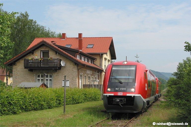 Durchfahrt durch den ehemaligen Bahnhof Eggingen, dessen Gebäude heute privat genutzt wird (08.06.2003).