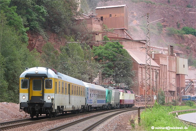 Auf der letzten Fahrt des Tages Richtung Trier fuhr der Messzug mit Messwagen voraus und den beiden Loks am Schluss (752 001 arbeitend) bei Taben vorbei, im Hintergrund die Hartsteinwerke Düro (12.06.2003).
