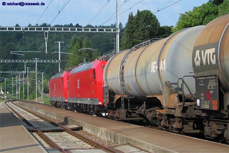 Nachschuss auf den nach Glattbrugg fahrenden Kesselwagenzug, bespannt mit 185 093 u. 127 (Lottstetten, 16.07.2003).