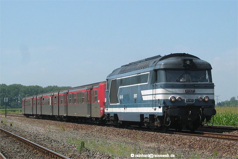 SNCF BB 67415 zieht ihre Wendezuggarnitur von Strasbourg nach Lauterbourg (Roppenheim, 23.07.2003).