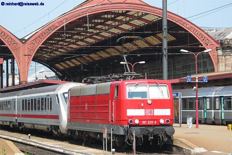 181 209 hat den EC 264 von Stuttgart nach Strasbourg gebracht, umgesetzt und wartet jetzt auf die Abfahrt als EC 267 nach München (23.07.2003).