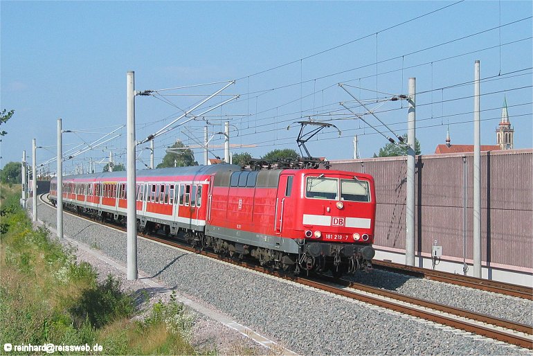 Die Baureihe 181 von R&T fährt auch Leistungen für DB-Regio, einige RE-Züge zwischen Karlsruhe und Offenburg fallen in diese Kategorie. 181 219 führt den RE 18119 Karlsruhe - Offenburg (Sinzheim, 01.08.2003).