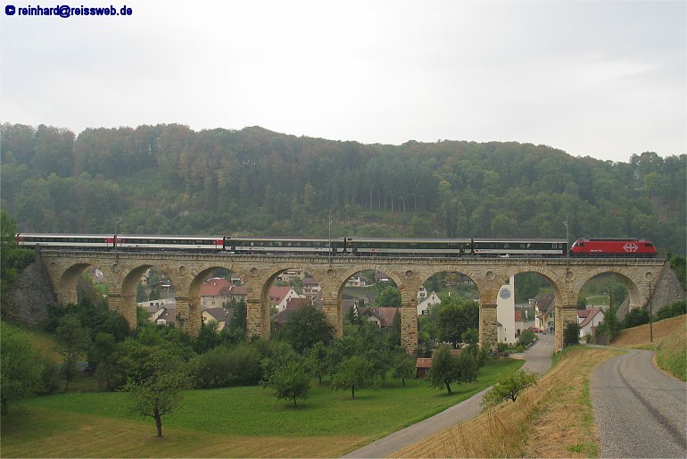 Während der Bauarbeiten an der Aarebrücke bei Olten werden einige Reisezüge über die alte Hauensteinstrecke umgeleitet, hier ist es IC 864 Bern - Basel SBB auf dem Rümlinger Viadukt (15.08.2003).