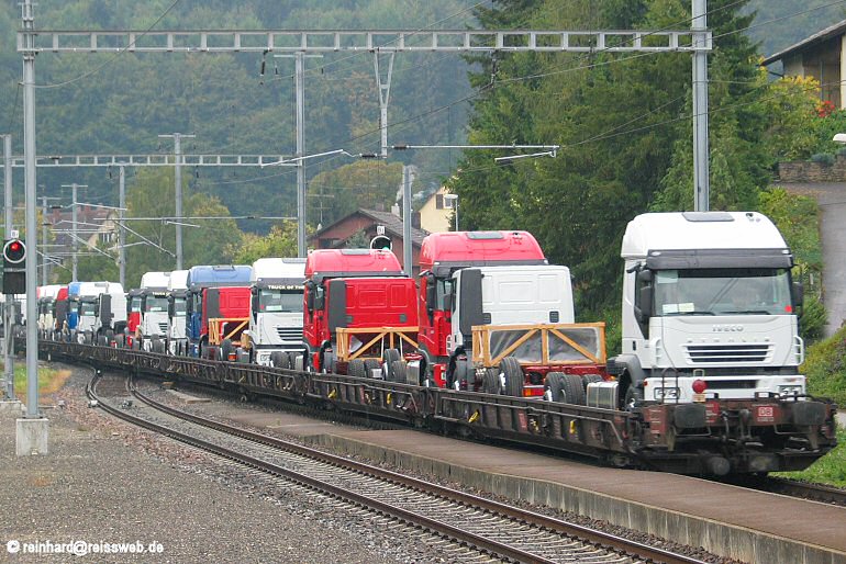 | Ein Geschäftsbereich der Spedition Bertani ist der Transport von Neufahrzeugen ab Werk. Da Iveco die Nutzfahrzeuge nach Typen gegliedert in Ulm und Italien produziert, werden zum Ausgleich Neufahrzeuge von Ulm nach Ospitalletto und zurück überführt (Lottstetten, 28.09.2003). |