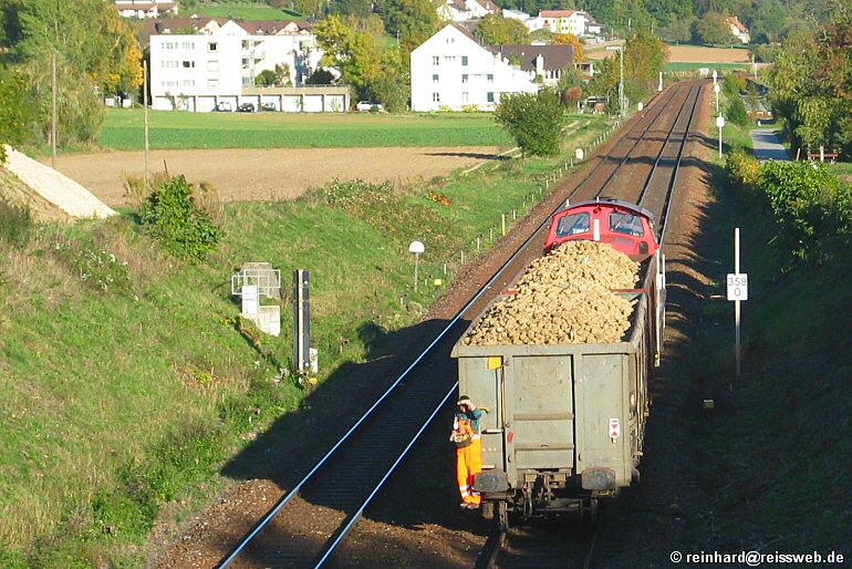 Nach dem Umsetzen in das Hauptgleis Richtung Neuhausen fährt 294 249 an die im selben Gleis stehen Neunkircher Wagen heran, um dann die Fahrt nach Schaffhausen fortzusetzen (Beringen, 15.10.2003).