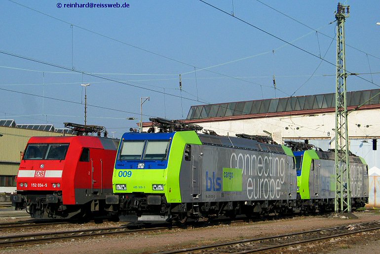 485 009 & 010 stehen neben 152 034 im Bh Haltingen (07.11.2003).