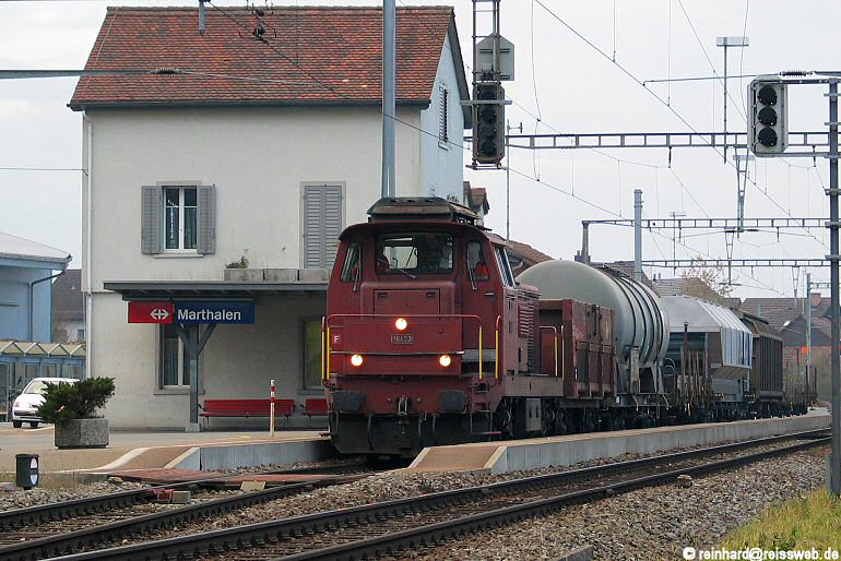 Ausfahrt der abendlichen Übergabe Richtung Schaffhausen mit einem bunt gemischten Güterzug. Im Gegensatz zum