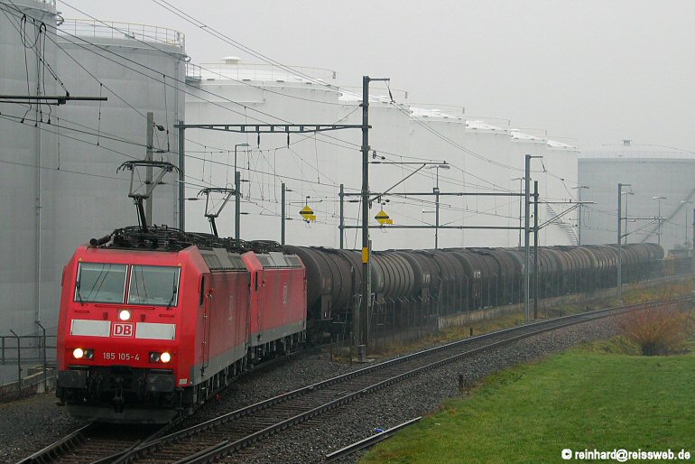 185 105 u. 091 stehen im Tanklager Bettwiesen. Früher wurden die Züge geteilt (10 Wagen/800 to pro Zug) und durch eine einzelne 150 geführt, ab Sommer 2002 bis zum Konkurs waren es MThB-Loks der BR 477 in