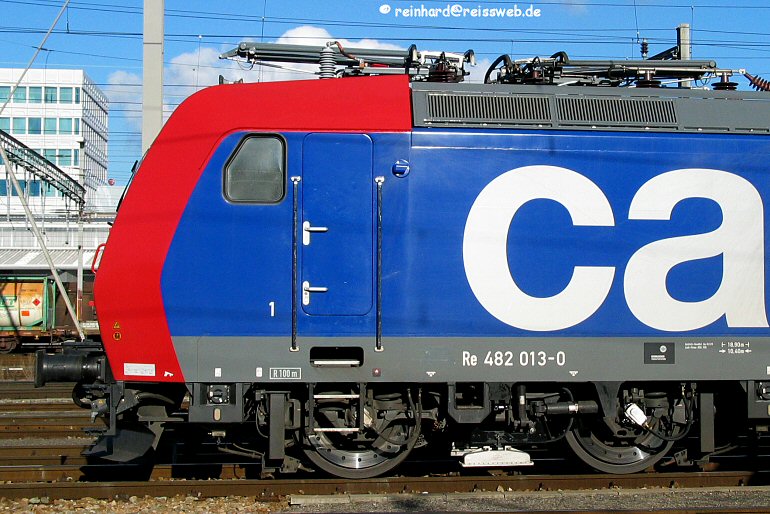 | 482 013 gehört zu den nachbestellten Loks (010 - 049), von denen fünf (010 - 014) ohne CH-Ausrüstung ausgeliefert wurden. Seit 17.12.03 hat 482 013 als erste dieser Loks ihre CH-Ausrüstung erhalten, erkennbar am fabrikneuen CH-Bügel (Basel, 29.12.2003). |