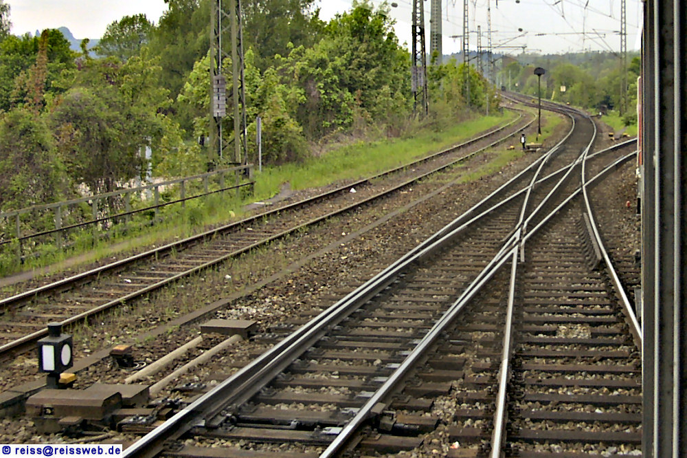 Je nach Betrachtungsweise sieht man hier eine “verbogene” EKW Bauart Baeseler oder zwei ineinander geschobene einfache Weichen, aufgenommen in der Westausfahrt Singen (Hohentwiel). Die "Standard"-Baeseler-EKW siehe