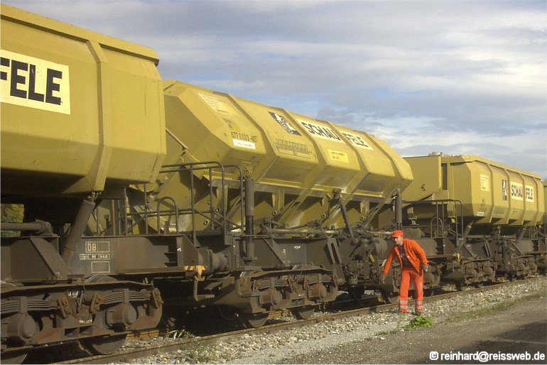 Entladevorgang von der anderen Seite gesehen. Nach der Entriegelung kippen die Mulden per Schwerkraft.