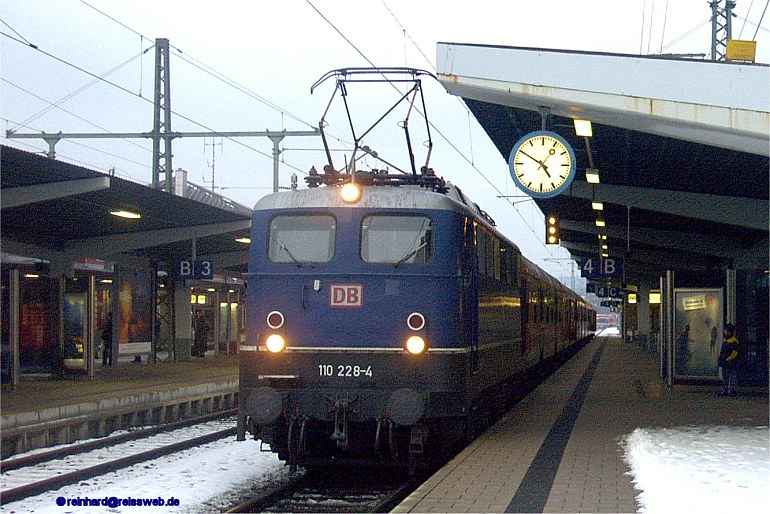 Überraschung kurz vor der Heimreise: Die blaue 110 228 traf mit dem RE 19613 aus Stuttgart ein (zwar nur 2 Gleise von 103 126 entfernt, aber ein gemeinsames Foto war aufgrund der örtlichen Verhältnisse nicht möglich (Singen, 14.01.2003).