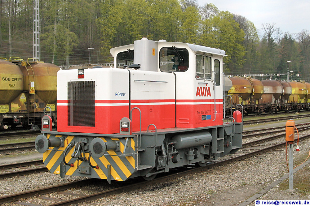 Tm 2/2 "Avia" steht im Auhafen Muttenz. Hier werden schwerpunktmässig Mineralölprodukte umgeschlagen, eine immense Anzahl von Werkloks ist im Bereich des Hafengeländes vorhanden. Anschriften der Lok siehe