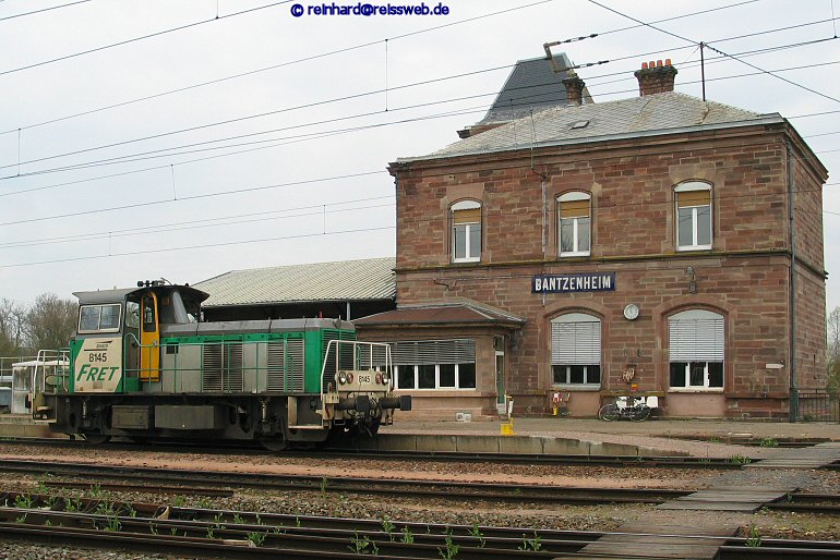 SNCF 8145 in der aktuellen "FRET"-Lackierung macht Pause im Bahnhof Bantzenheim an der Strecke Mulhouse - Chalampe - Neuenburg (15.04.2004).
