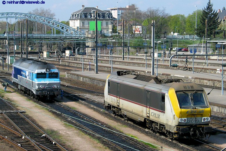 Im Bahnhofsbereich von Mulhouse sind CC72190 vom SNCF-Fernverkehr (sie wird gleich darauf den D 1044 nach Paris übernehmen) und CFL 3019 abgestellt (15.04.2004).