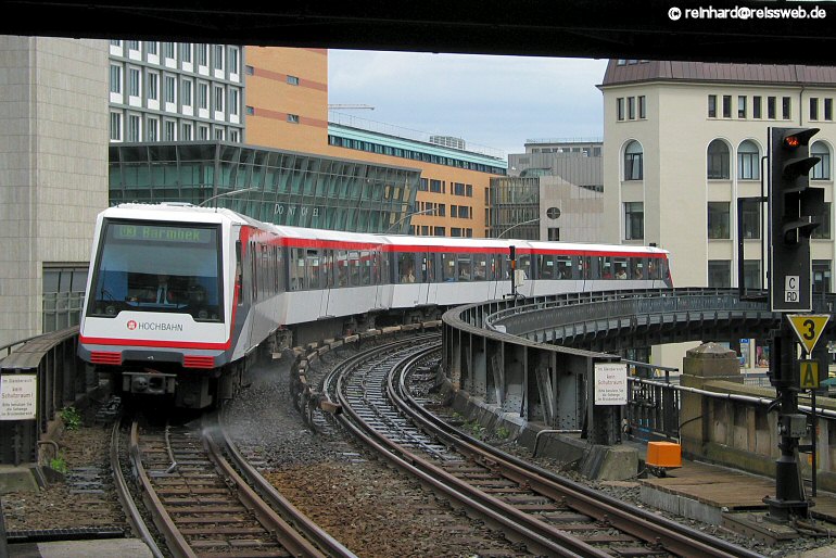 Eine Garnitur aus DT4-Fahrzeugen, die die modernste Fahrzeugbaureihe bei der Hamburger Hochbahn darstellt, fährt in die Station Rödingsmarkt ein (15.05.2004).