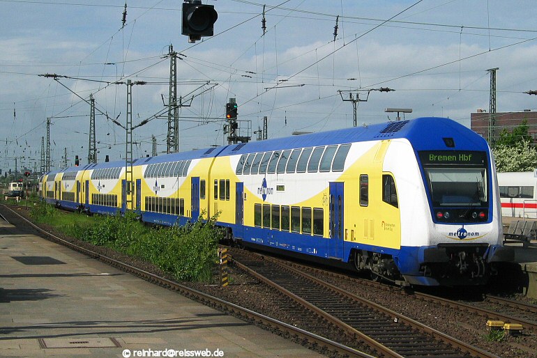 Die Metronom-Züge bestehen aus Garnituren mit 6 Doppelstockwagen, 2 Züge sind 8-Wagen-Einheiten. Die Wagen sind mit denen der DB AG vergleichbar, alle Züge verfügen über je einen Bistro-Bereich an jedem Ende (Hamburg-Altona, 15.05.2004).