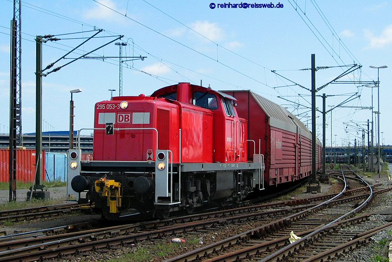 | 295 053 entstammt einer Baureihe, die nur in Norddeutschland im Einsatz steht. Der Baureihe 294 sehr ähnlich, hat sie einen langsamlaufenden Dieselmotor und wurde von MAK gebaut. Näheres zu den Wagen hinter der Lok gibt es hier (Bremerhaven, 16.05.2004). |