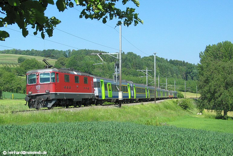 Ende Mai 2004, knapp ein halbes Jahr vor der Übergabe an die BLS, waren die EWIII-Kompositionen schon weitgehend umlackiert. Im Zug 2569 Schaffhausen - Zürich befindet sich nur noch ein Wagen in der originalen Lackierung (Lottstetten, 29.05.2004).