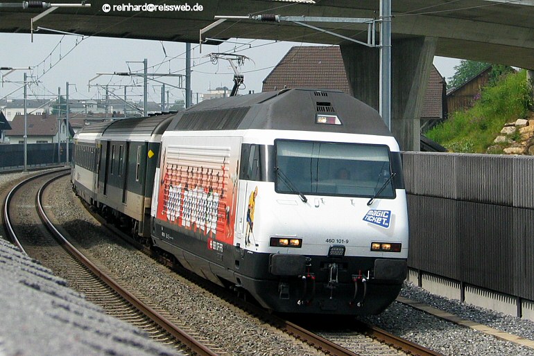 | 460 101 "Magic Ticket", zum Zeitpunkt ihrer Aufnahme die neueste Werbelok der SBB (ihre Lackierung wurde am 02.06.04 der Öffentlichkeit vorgestellt), passiert am 04.06.2004 Rothrist Richtung Olten - Zürich. Die Lok trägt einen Stromabnehmer der Bauart Faiveley. |