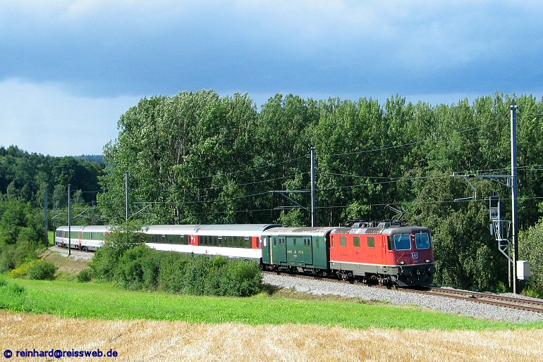 Ein Gewitter lag in der Luft, aber für IC 381 "Insubria" mit Re 4/4 II 11200 an der Spitze schien noch die Sonne, als der Zug am 13.08.2004 die "Fotografierwiese" bei Lottstetten passierte.