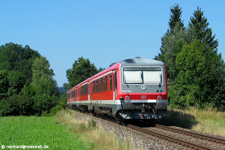 Eine 628-Doppeleinheit mit 628 418 am Schluss war am 28.08.2004 zwischen Tittmoning-Wiesmühl und Kirchweidach unterwegs.