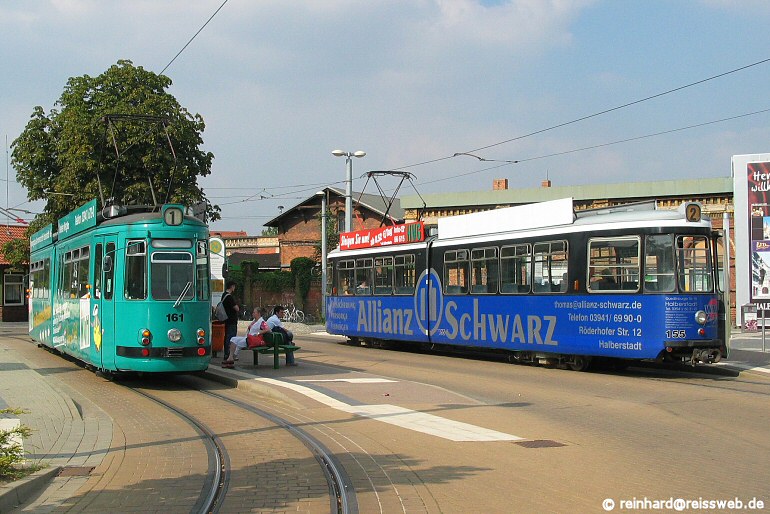 Bunt gemischt ist der Fahrzeugpark der Strassenbahn in Halberstadt, ein ex-Stuttgarter Einrichtungswagen (im Bild rechts) und der Zweirichtungswagen GT4 161 (ein ehemaliger Freiburger) treffen sich an der Haltestelle Hauptbahnhof (07.09.2004).