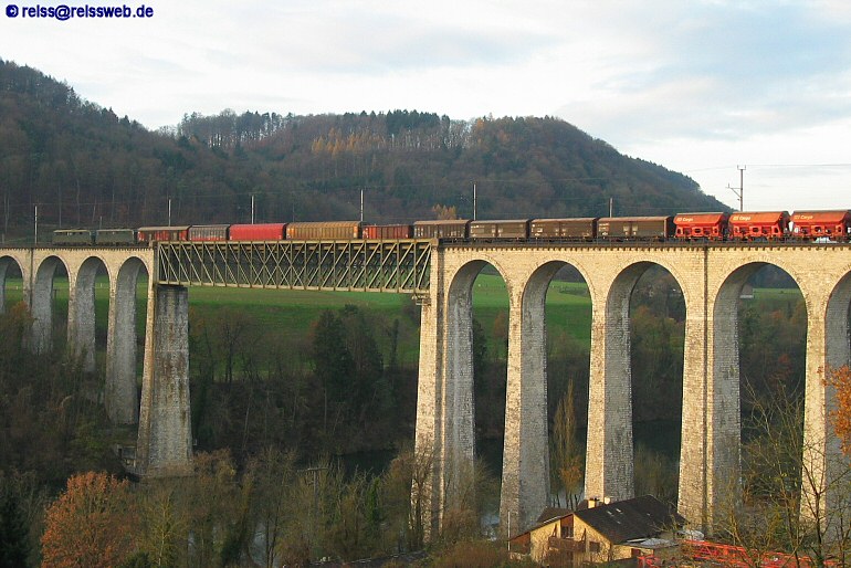 Bereits einen guten Namen unter Eisenbahnfreunden hat Zug 44699 Singen - RB Limmattal, der von 2 Ae 6/6 gezogen wird. Am 24.11.2004 passieren 2 grüne Städte-Loks der Reihe Ae 6/6 die Eglisauer Rheinbrücke.
