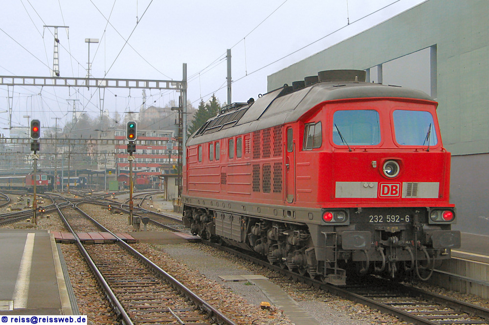 232 592 hat einen Güterzug nach Schaffhausen gebracht und fährt im Blockabstand zu CIS 156 wieder zurück nach Singen (28.11.2004).