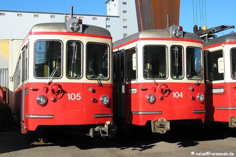 Die Forchbahn-Steuerwagen Bt 104 u. 105 stehen im Auhafen Muttenz, bereit zur Verladung auf ein Rheinschiff. Dem Vernehmen nach soll die Reise nach Madagaskar gehen (09.02.2005).