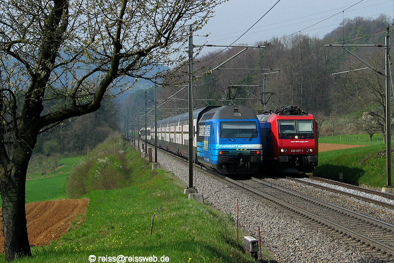 Zufallstreffer? Nicht ganz, denn das rot zeigende Hauptsignal im Rücken des Fotografen zwang 482 017 zur Fahrt im Schritttempo, damit war es sehr viel einfacher, diese Sitation abzulichten (Villnachern, 06.04.2005).