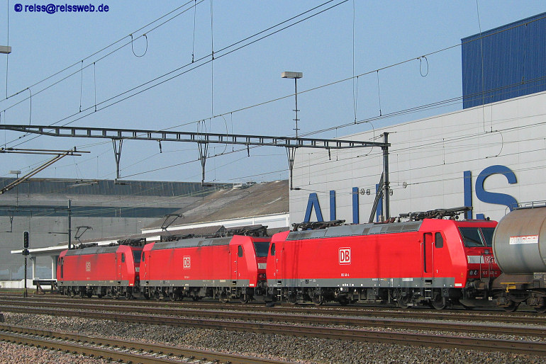 | Überraschung am 14.04.2005 - einer der morgendlichen Kesselwagenzüge aus Singen erreichte Niederglatt mit 3 Loks (185 101, 124 u. 148). Zwei Maschinen verliessen Niederglatt mit Ziel Basel, 185 148 brachte die Leerwagen am Nachmittag zurück nach Singen. |