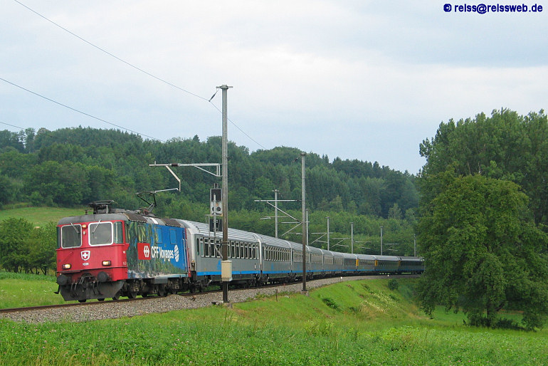 Immer wieder interessant ist die Bespannung des EC 171, Re 4/4 II 11228 "Kuoni", die letzte verbliebene Werbelok aus dieser Baureihe, führt am 30.06.2005 EC 171 von Schaffhausen nach Zürich.