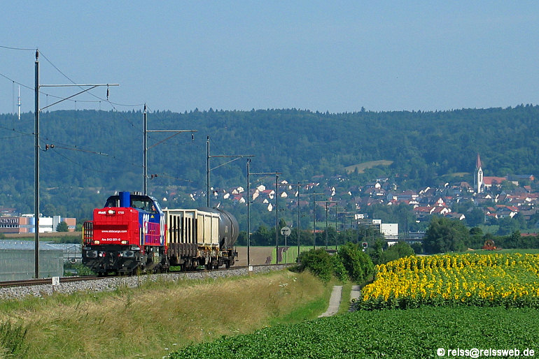 Am 843 091 hat Diessenhofen verlassen und fährt auf Schlattingen zu, im Hintergrund ist die Ortschaft Gailingen zu erkennen (13.07.2005).