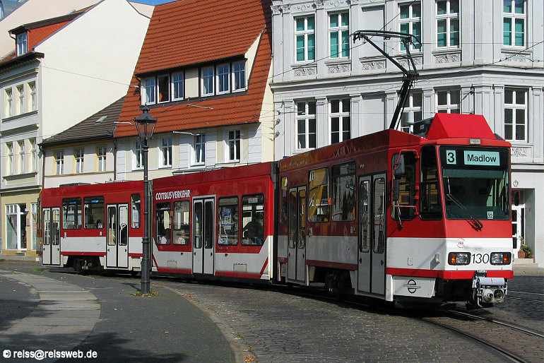 Wagen 130 der Cottbuser Strassenbahn im Einsatz auf der Linie 3, aufgenommen zwischen den Haltestellen Sandower Brücke und Altmarkt (28.08.2005).