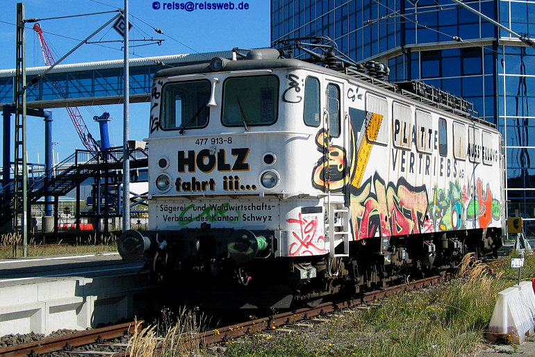 hat ex-MThB 477 913 erlebt - noch in der unveränderten MThB-Werbelackierung (aber mit Graffity verunziert) verbringt sie ihre Zeit als Heizlok in Mukran (30.08.2005).