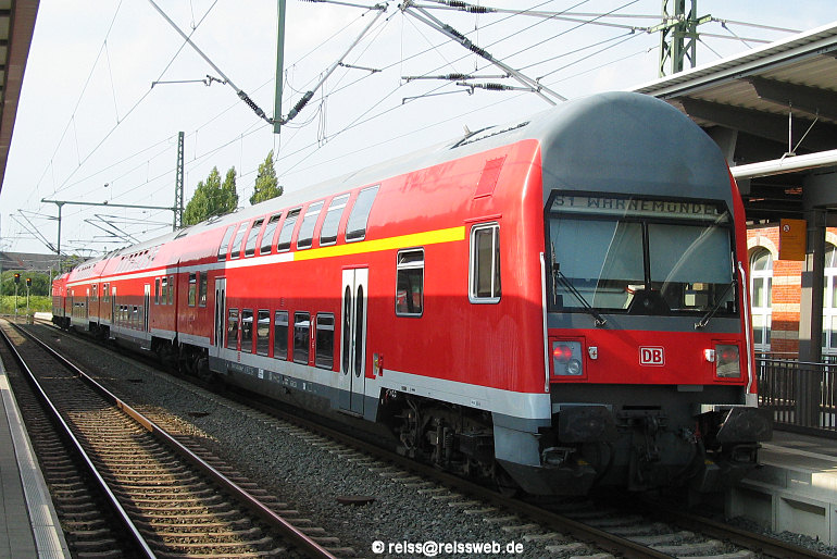 Eine S-Bahn nach Warnemünde mit unbekannter 143 an der Zugspitze wartet in Rostock Hbf auf die Abfahrt ins 20 Minuten entfernte Warnemünde (07.09.2005).