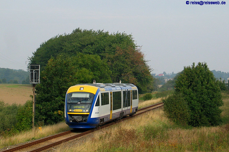 Zwischen Bergen und Lauterbach Mole auf der Insel Rügen verkehren Züge der Connex-Tochter OME. Ein Desiro in den aktuellen Connex-Farben hat soeben Bergen verlassen und macht sich auf den Weg nach Lauterbach Mole (08.09.2005).